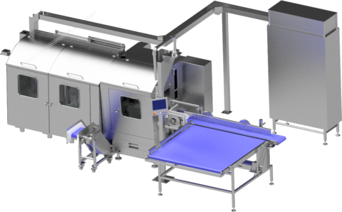 Unsere Anlagen können Teigstränge von bis zu 3000 mm Länge formen. Dabei wird der Teig gleichförmig gewalkt und gewichtsgenau ausgepresst. So sind gleichgroße Portionen Teig mit höchster Qualität reproduzierbar. Zudem lassen sich die Teigstränge ober- und untermehlen. Dies wird getrennt angewählt und separat gesteuert. Im Anschluss werden die Teigstränge auf Förderbändern abgelegt und aus der Anlage abtransportiert.