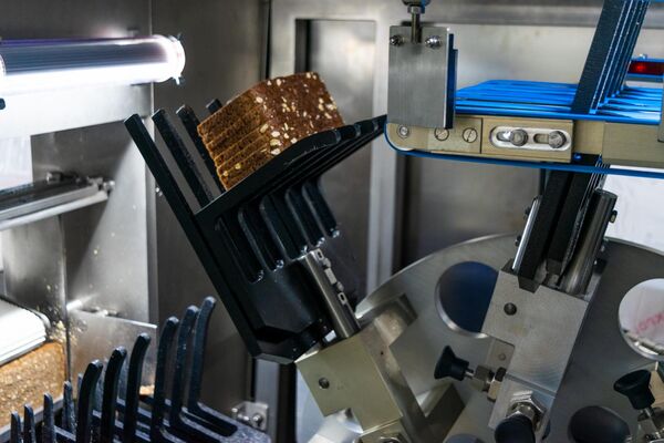 Auf der Anlage lassen sich handelsübliche Brotsorten bis zu einer maximalen Länge von 3000mm verarbeiten. Dabei dürfen die Brote nicht breiter als 240mm bzw. höher als 150mm sein. Über eine Servoachse kann der Obertransport passend auf die Höhe des Brotlaibs eingestellt werden. Das Getriebe des Kreismessers lässt dieses zum einen um seine eigene Achse rotieren, zum anderen führt das Messer eine oszillierende Bewegung aus. Mit bis zu 600 Schnitten/ Minute schneidet die Klinge durch die Brotlaibe und liefert dabei saubere Schnittkanten und gleichbleibende Brotscheibenstärken. Die Brote können in Scheiben von 4-15mm geschnitten und anschließend in Stapeln von 28 bis zu 90mm Höhe ausgegeben werden.