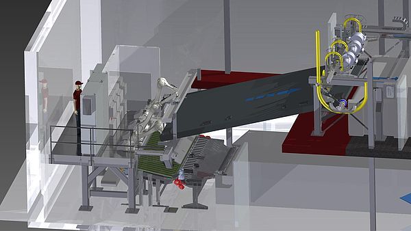 Diese Anlage dient zum Umsetzen von Produkten. Durch einen Kamera erkennt der Roboter die aktuelle Lage der Produkte auf dem Förderband und verarbeitet diese Informationen. Der Roboterarm greift mit einem Vakuumgreifer zu und positioniert die Produkte anschließend ausgerichtet auf einem weiteren Förderband. Nachdem die Produkte das Ende der Förderstrecke erreicht haben, übernimmt ein Handlingsystem mit Vakuumgreifer die Objekte und übergibt sie an ein drittes Förderband. Am Ende des dritten Förderbandes verteilt ein weiteres Handlingsystem die Produkte auf zwei neue Förderbänder.