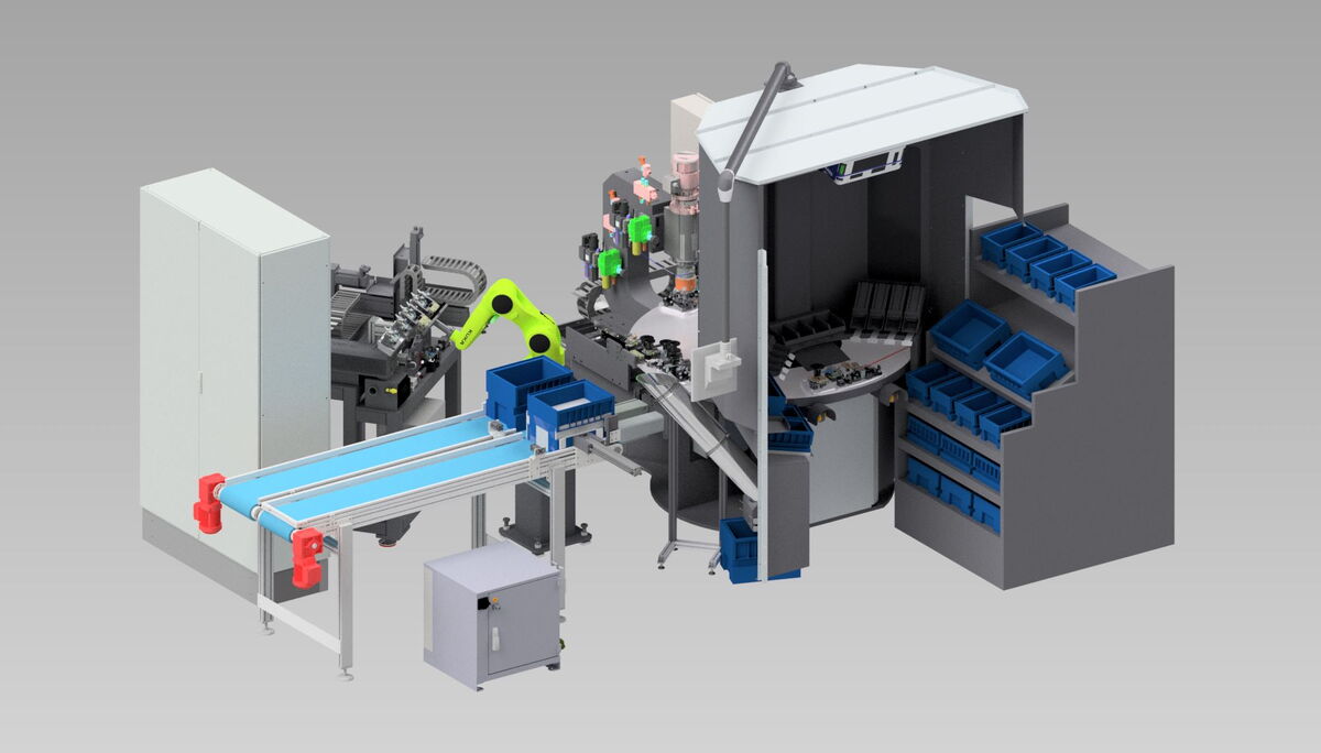 Die Maschine dient der halbautomatischen Montage von Doppelhubschlössern. Bei einer Anzahl von ca. 40 Arbeitsgängen pro Bauteil, war hier eine schnelle Anlernung des Bedienpersonals wichtig, weshalb eine Werkerführung in die automatisierte Maschine eingebunden wurde, welche eng verknüpft mit der SPS ein kompliziertes Produkt leicht montierbar macht. Die Vernietung, Verstemmung und Prüfung sind vollautomatisch realisiert.