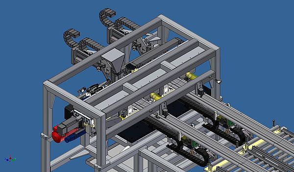 Über den Rollengang werden parallel zwei Aluminiumprofile der Doppelsäge zugeführt. Die Zuführung der Produkte zum Spannen, Sägen sowie Bürsten erfolgt über zwei parallele Beladeachsen. Hier nimmt eine dem Produkt entsprechende Spannvorrichtung das Profil auf. Anschließend erfolgt das Ablängen der Werkstücke in der Sägestation. Der, durch das Sägen, entstandene Grat wird mittels integrierter Bürsten entfernt. Welches zum Greifen ein dem Produkt entsprechendes Wechselgreifersystem hat. Sobald die gesägten Abschnitte aus der Spannvorrichtung entnommen sind, werden sie in eine weitere Bürstposition gefahren. Die integrierte Bürste entgratet nun parallel die 2. Seite der Abschnitte im Wechselgreifsystem und die 1. Seite der nachfolgenden Abschnitte in der Spannvorrichtung. Die Entnahmehandlings fahren anschließend in die Ablageposition über die wartenden Werkzeugträger (WT) auf dem Transportband, schwenken die Greifer um 90° nach unten und legen die Werkstücke dort ab.