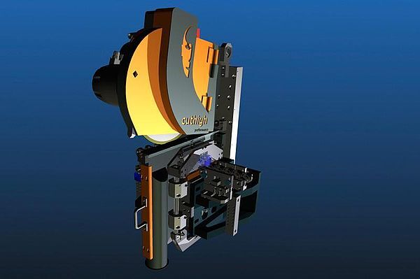 Ein auf einem Schlitten montierter Sägekopf trennt mittels Sägevorschub Aluminiumprofile. Die Werkstück- und die Sägeblattaufnahmen können ohne größeren Aufwand umgerüstet werden.