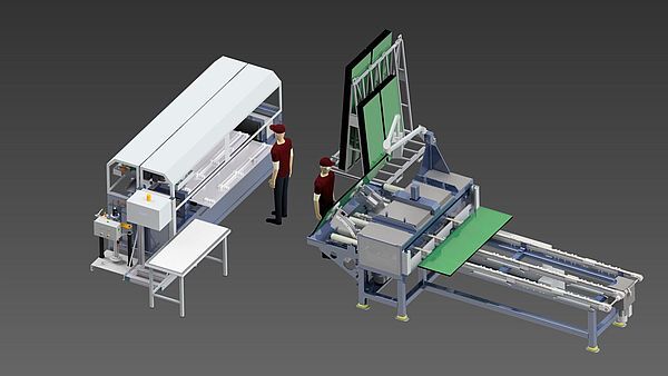Die Glasscheibe wird über den Glasquertransport zum Kipptisch befördert, wo diese in eine horizontale Lage geschwenkt und in die Türvormontage gefahren wird. Der Bediener setzt die, mit Kleber versehenen, Rahmenteile auf die Scheibe. In der Türmontage werden die Teile gleichmäßig aufgedrückt.